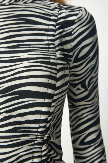 Dik yaka, esnek yapılı, uzun kollu, çapraz büzgü detaylı viskon elbise