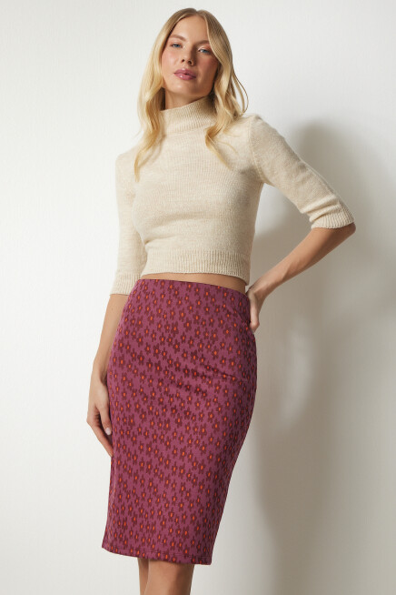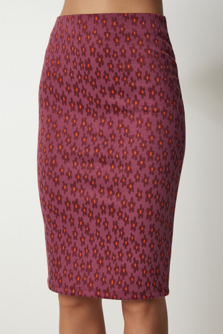 Elastik bel, arkadan yırtmaçlı, esnek yapılı, likralı, desenli, triko kalem etek