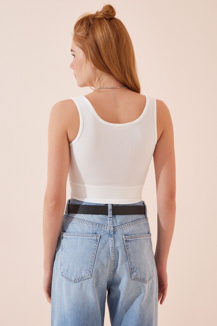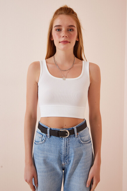 Kare yaka, askılı, fitilli, likralı crop örme bluz.