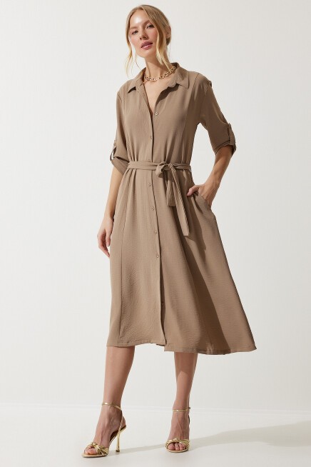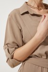 Düğme kapamalı, 4/3 ayarlanabilir kol, astarsız, yanlardan cepli, kuşaklı gömlek elbise