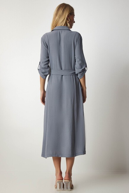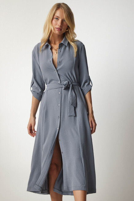 Düğme kapamalı, 4/3 ayarlanabilir kol, astarsız, yanlardan cepli, kuşaklı gömlek elbise