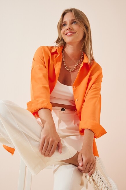 Oversize, uzun, kenarları oval kesim, rahat kalıp gömlek