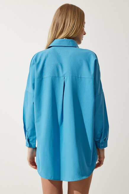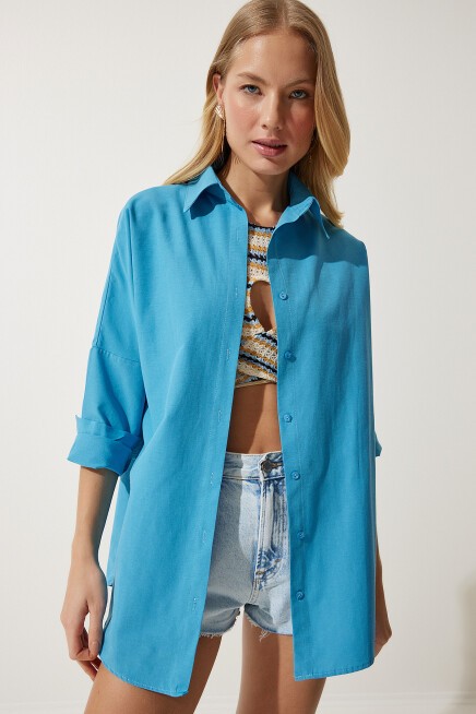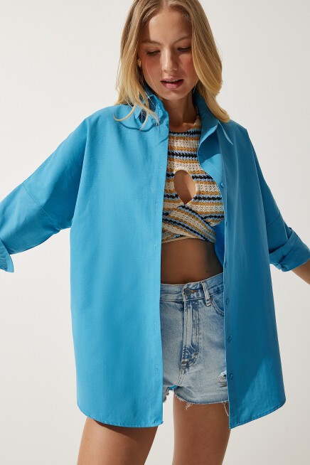 Oversize, uzun, kenarları oval kesim, rahat kalıp gömlek.