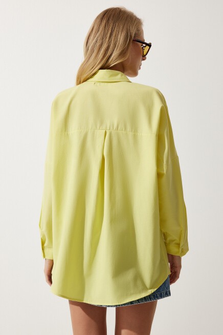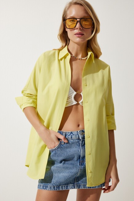 Oversize, uzun, kenarları oval kesim, rahat kalıp gömlek.