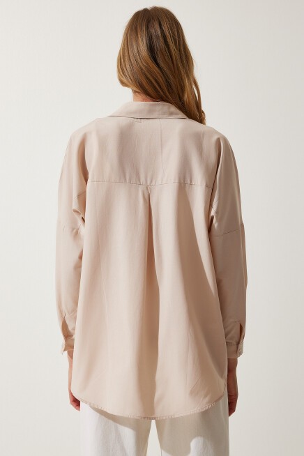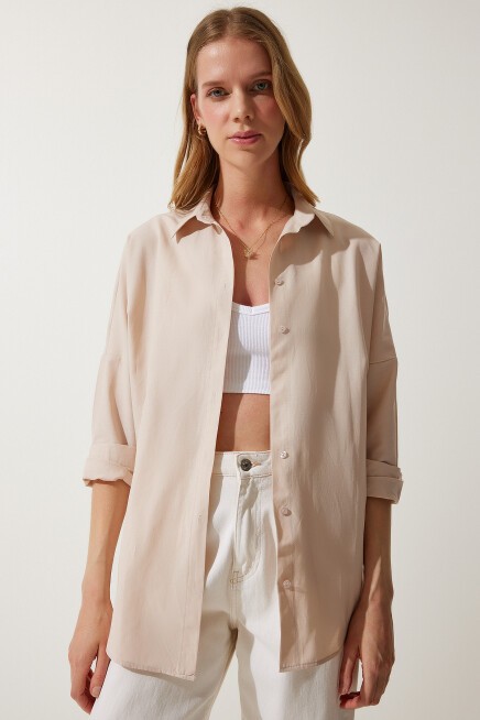 Oversize, uzun, kenarları oval kesim, rahat kalıp gömlek.