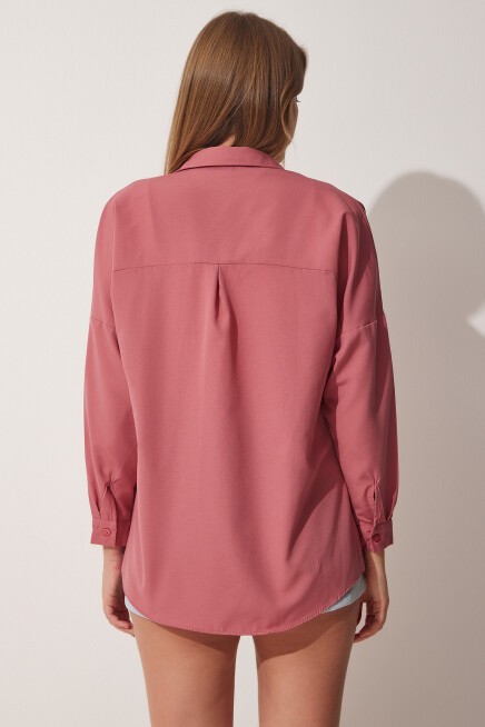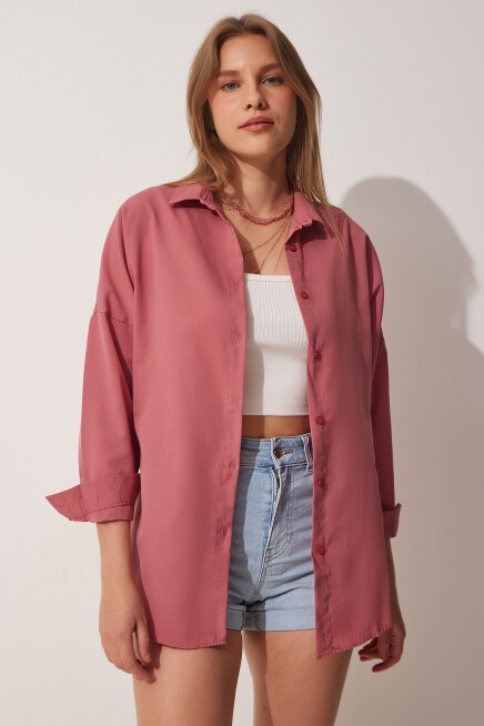 Oversize, uzun, kenarları oval kesim, rahat kalıp gömlek.