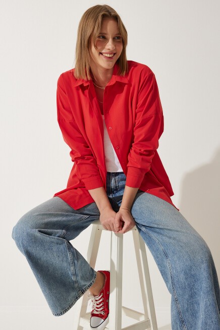 Oversize, uzun, kenarları oval kesim, rahat kalıp gömlek.
