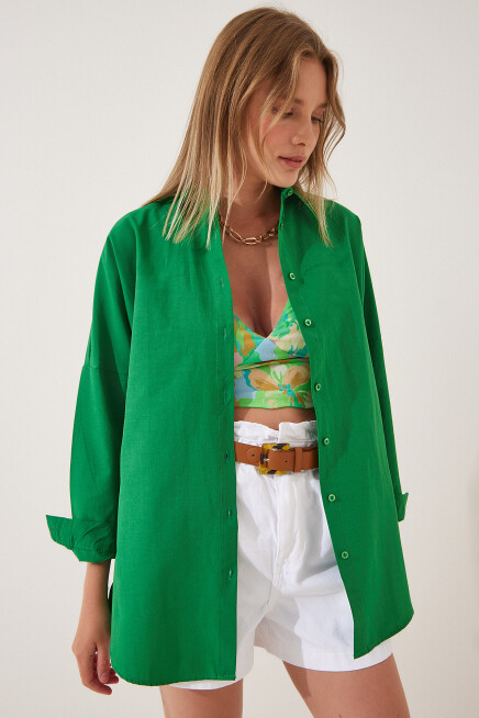 Oversize, uzun, kenarları oval kesim, rahat kalıp gömlek.