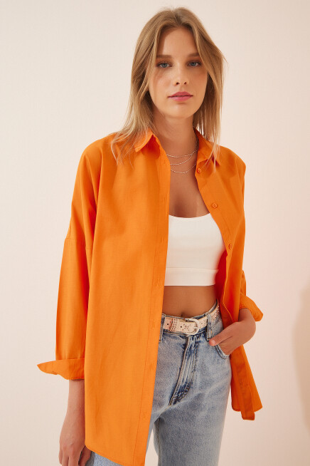 Oversize, uzun, kenarları oval kesim, rahat kalıp gömlek.