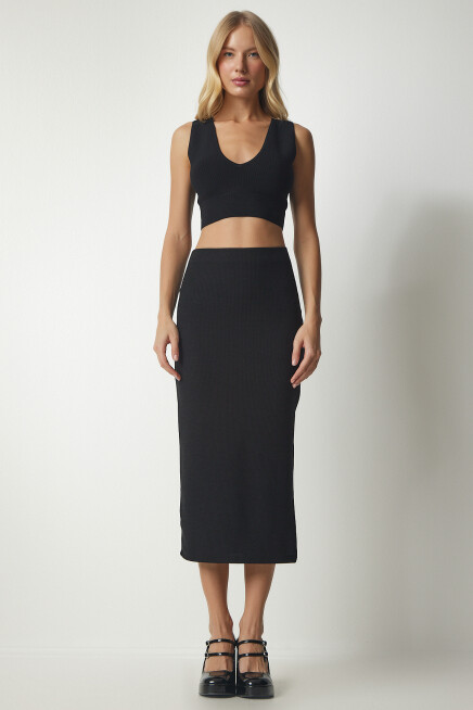 Elastik bel, esnek yapılı, tek yırtmaçlı, fitilli örme kalem etek