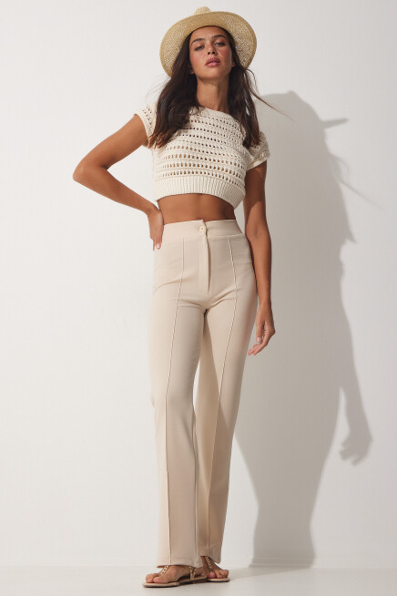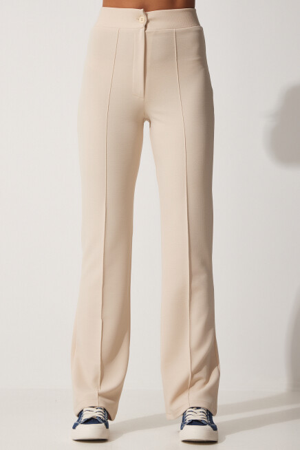 Elastik yüksek bel, düğme fermuar kapamalı, yüksek bel likralı örme pantolon