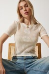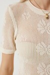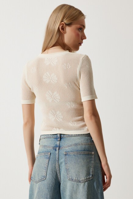 Bisiklet yaka, çiçek desenli ajurlu, likralı, kısa kollu yazlık crop triko bluz