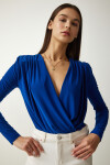 Anvelop yaka, vatkalı, büzgü detaylı, çıtçıtlı örme bluz