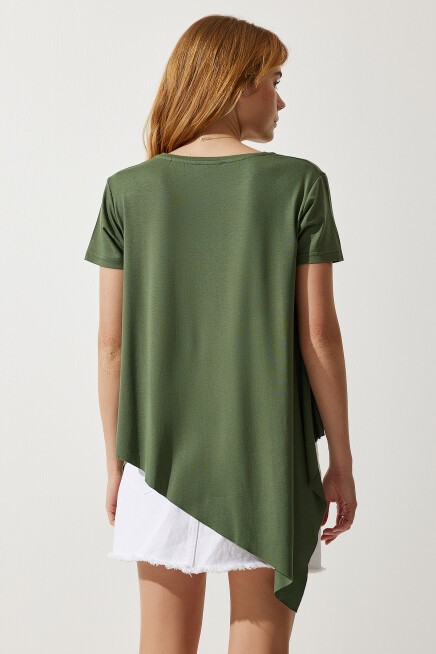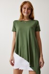 Bisiklet yaka, asimetrik kesim, dökümlü, likralı, kenarları dikişsiz, viskon örme tunik
