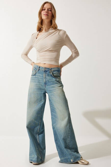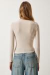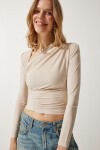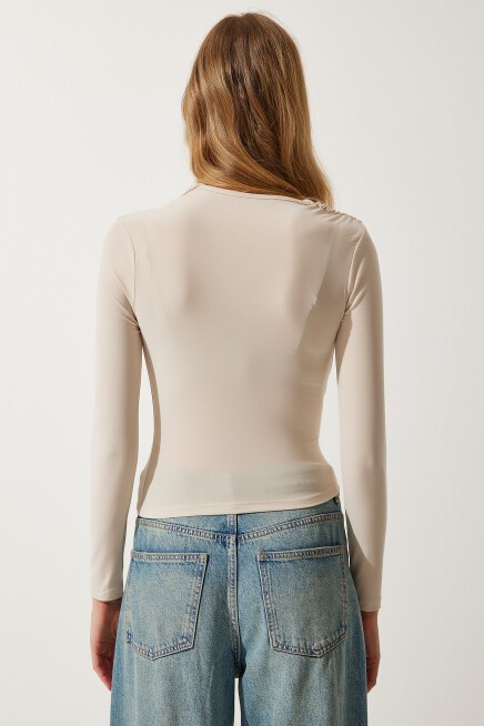 Asimetrik yaka, esnek yapılı, büzgü detaylı sandy bluz