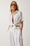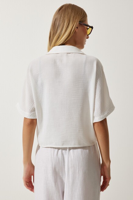 Polo yaka, düşük omuzlu, kısa kollu, bağlama detaylı keten bluz