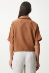Polo yaka, düşük omuzlu, kısa kollu, bağlama detaylı keten bluz