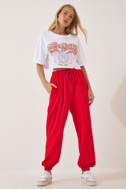 Ayarlanabilir ipli elastik bel, yan cepli, paçaları lastikli, bol, rahat kalıp jogging eşofman altı.