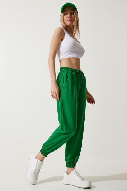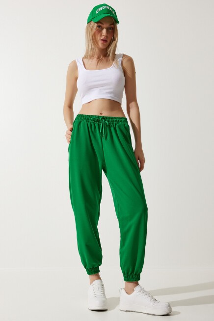 Ayarlanabilir ipli elastik bel, yan cepli, paçaları lastikli, bol, rahat kalıp jogging eşofman altı.