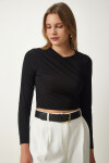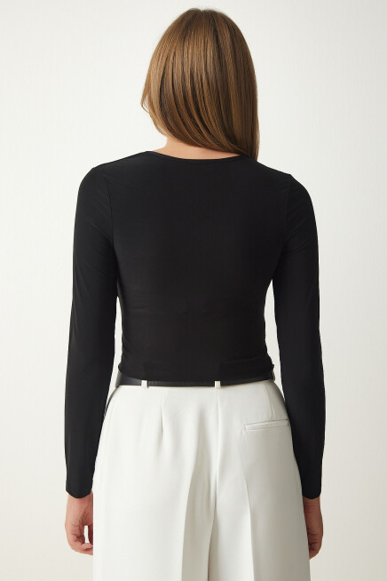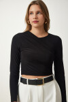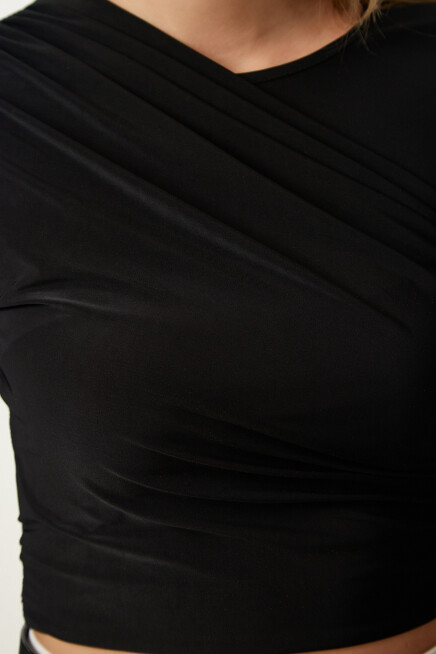 Bisiklet yaka, esnek yapılı, büzgü detaylı crop sandy bluz