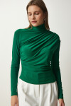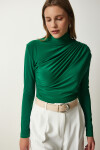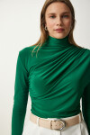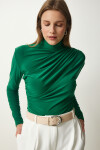 Dik yaka, esnek yapılı, dökümlü, büzgü detaylı sandy bluz