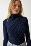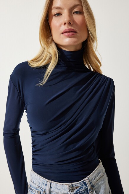 Dik yaka, esnek yapılı, dökümlü, büzgü detaylı sandy bluz