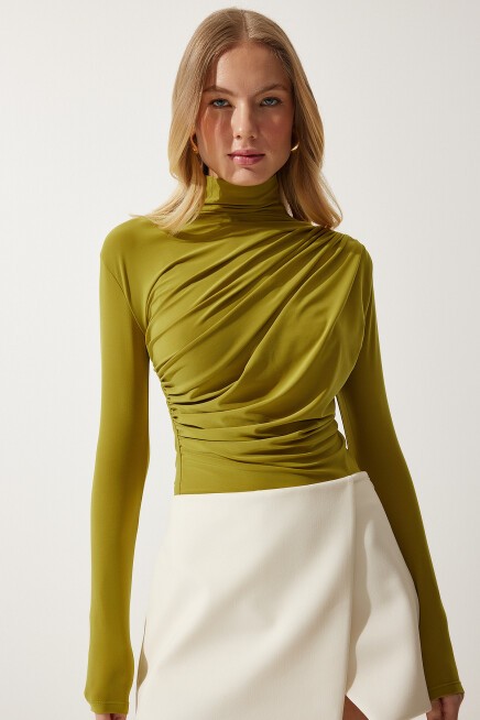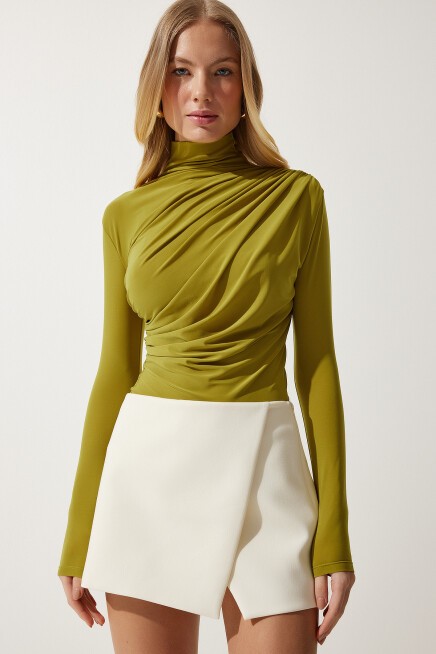 Dik yaka, esnek yapılı, dökümlü, büzgü detaylı sandy bluz