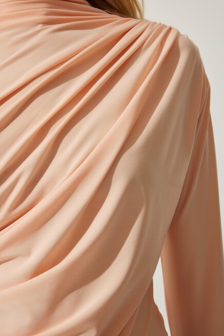 Dik yaka, esnek yapılı, dökümlü, büzgü detaylı sandy bluz
