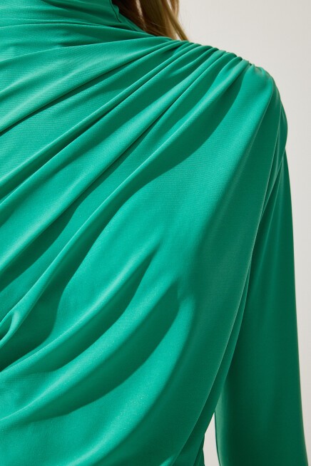 Dik yaka, esnek yapılı, dökümlü, büzgü detaylı sandy bluz