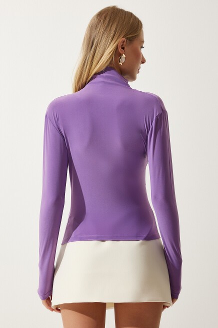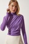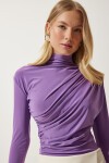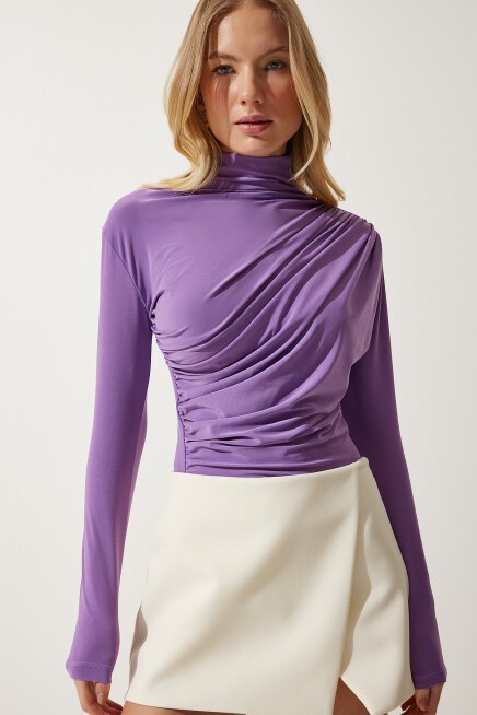 Dik yaka, esnek yapılı, dökümlü, büzgü detaylı sandy bluz