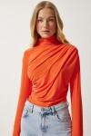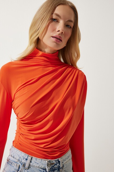 Dik yaka, esnek yapılı, dökümlü, büzgü detaylı sandy bluz