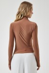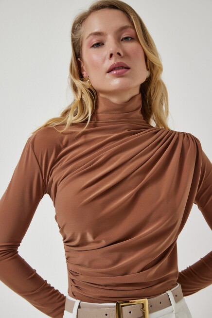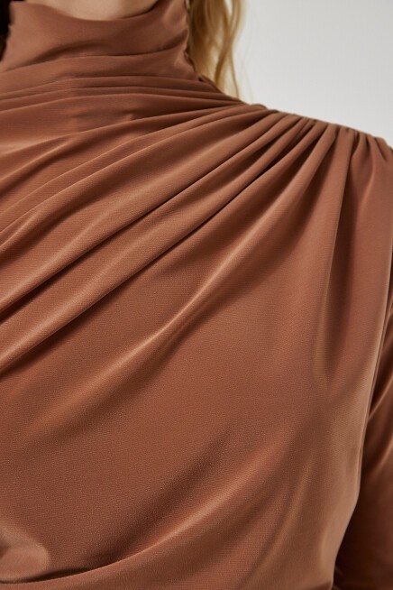 Dik yaka, esnek yapılı, dökümlü, büzgü detaylı sandy bluz