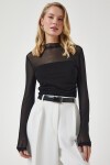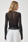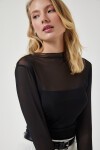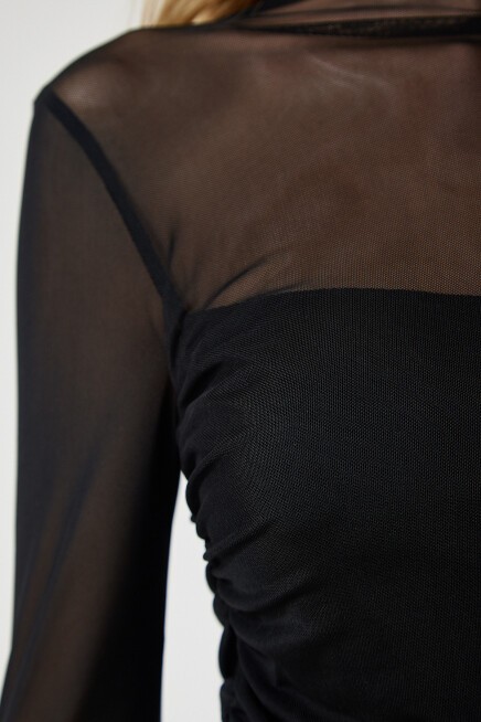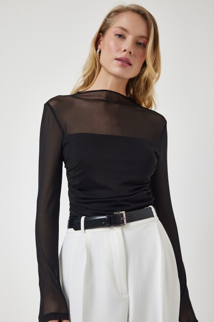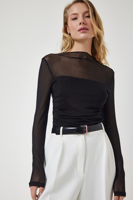 Hafif dik yaka, yanlardan büzgü detaylı, esnek yapılı, transparan şifon bluz