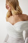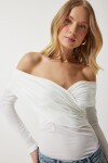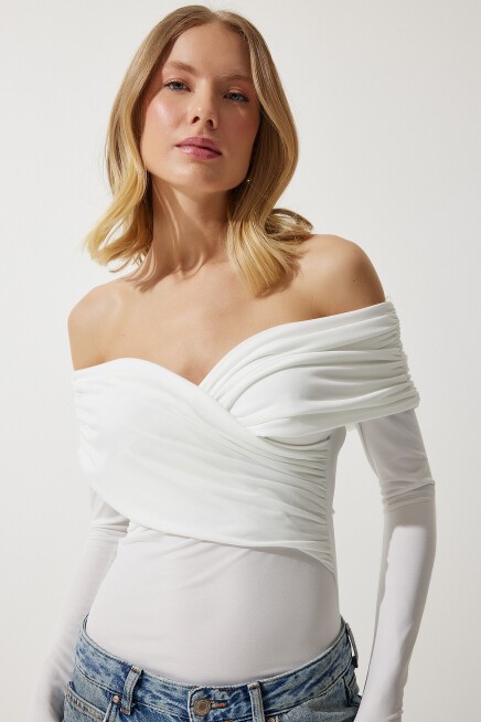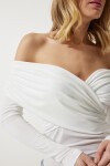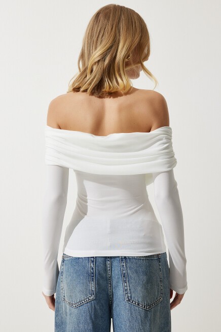Açık omuz, uzun kollu, büzgülü, sandy örme bluz
