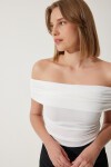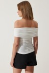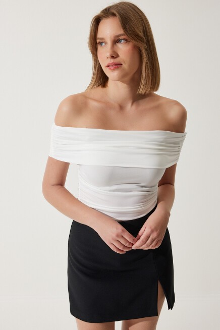 Büzgülü, kolsuz, carmen yaka, sandy bluz