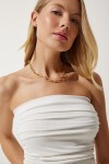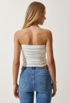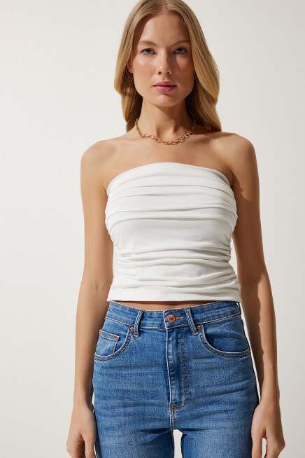 Straplez yaka, büzgü detaylı, çift kumaş, esnek yapılı örme bluz