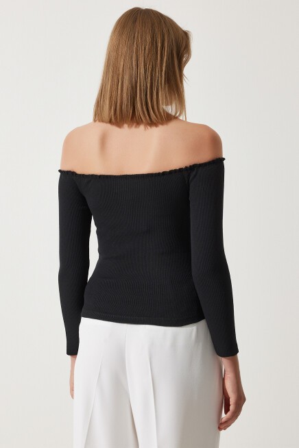 BÜZGÜLÜ YAKA CROP ÖRME BLUZ