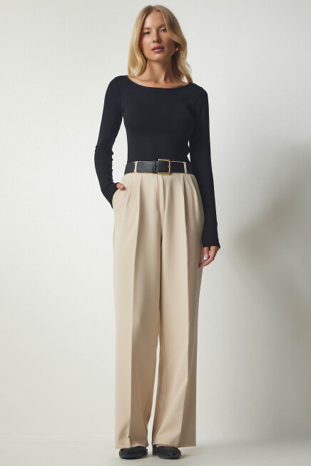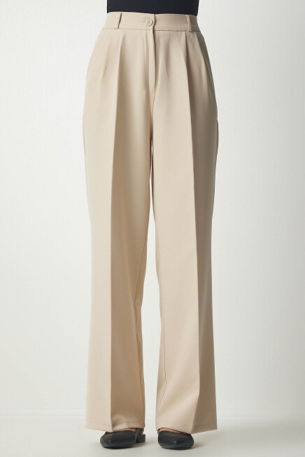 Fermuar ve düğme kapamalı, arkası elastik bel, yanlardan cepli, önden mini pilili, basic palazzo pantolon