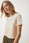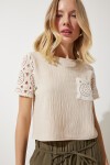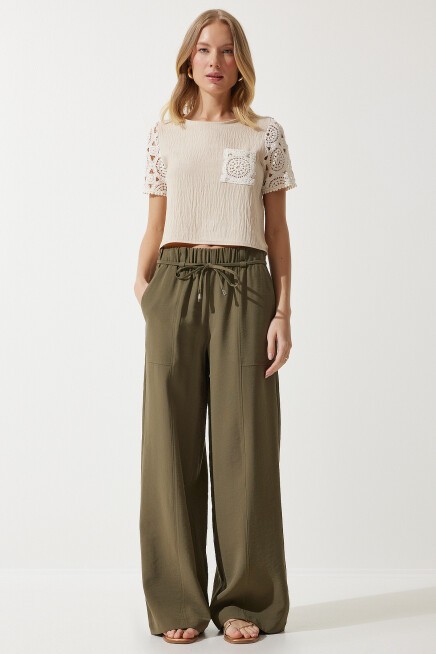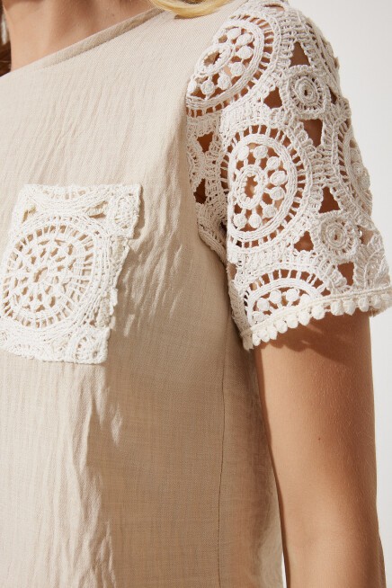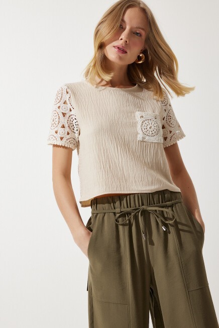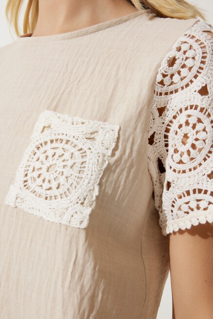 Bisiklet yaka, dantel kol ve cep detaylı, crop keten bluz