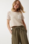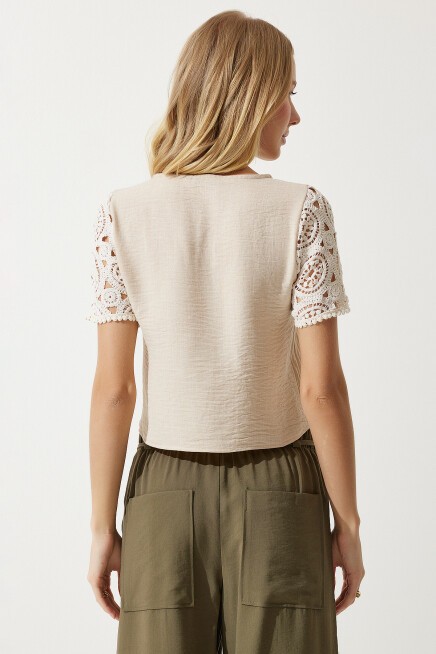 DANTEL DETAYLI CROP KETEN BLUZ