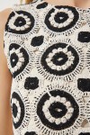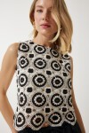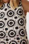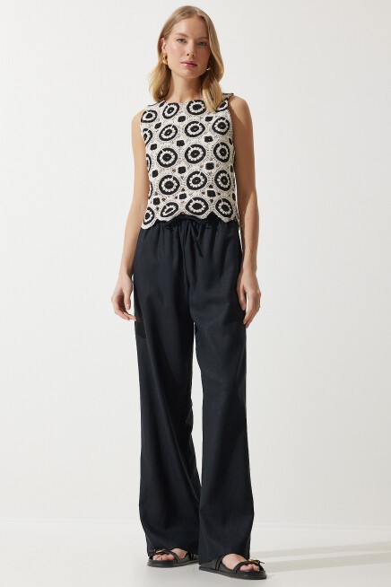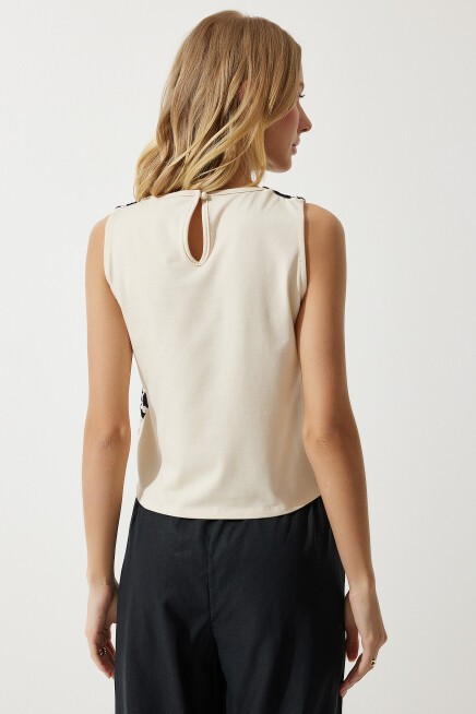 Bisiklet yaka, kolsuz, iç astarlı, enseden düğme kapamalı, dantelli keten bluz