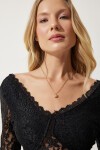 V yaka, esnek yapılı, arkadan kopça kapamalı, dantelli şık örme crop bluz