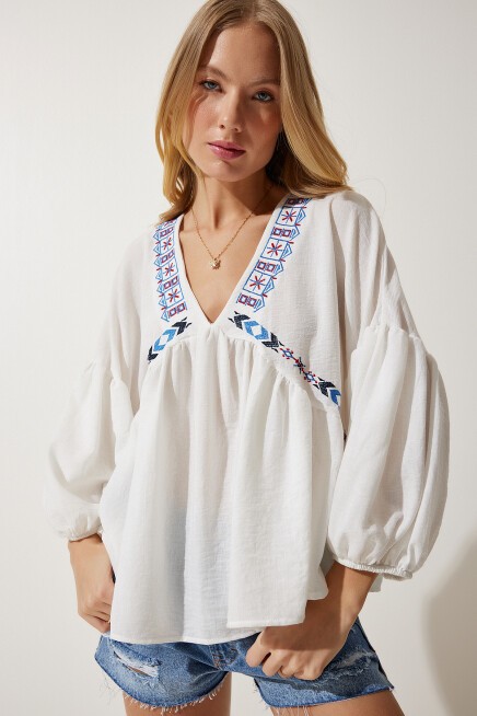 Derin V yaka, düşük omuzlu, geniş kesim kol, çiçek işlemeli keten yüzeyli bluz