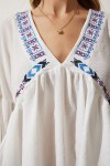 DERİN V YAKA VOLANLI NAKIŞLI KETEN BLUZ