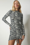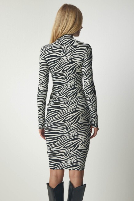 Dik yaka, esnek yapılı, uzun kollu, çapraz büzgü detaylı viskon elbise
