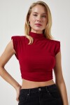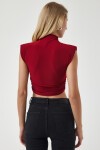 Dik yaka, kolsuz, vatkalı, esnek yapılı, yanlardan büzgü detaylı crop örme bluz