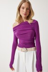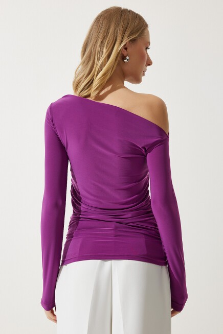 Dökümlü yaka, uzun kollu, yanlardan büzgü detaylı bluz