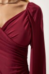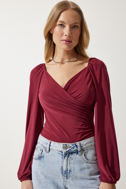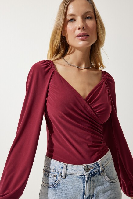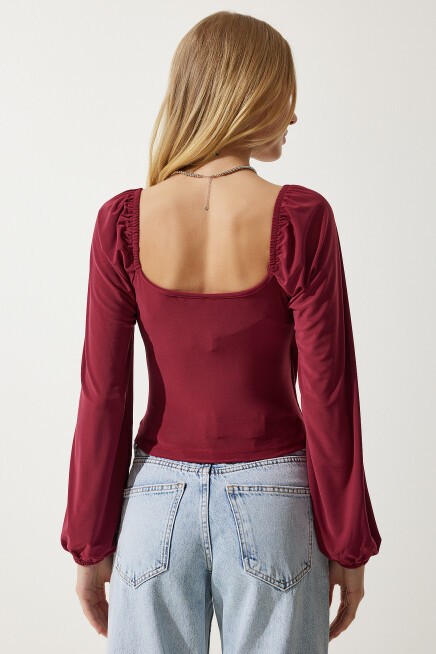Elastik balon kollu, esnek yapılı, büzgülü crop örme bluz