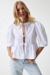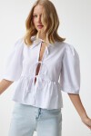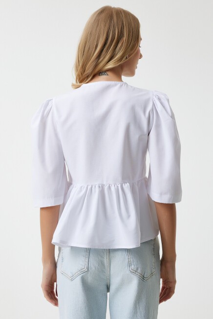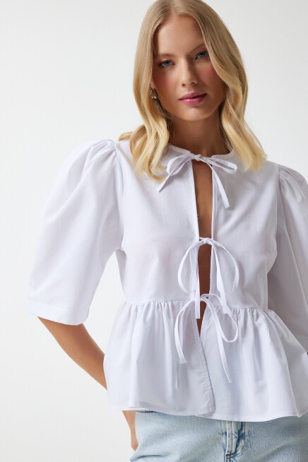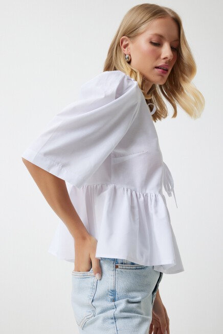 Fiyonklu, balon kollu, volanlı pamuk poplin bluz
