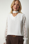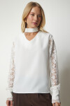 Pencere detaylı V yaka, güpür detaylı kol, dökümlü şık bluz